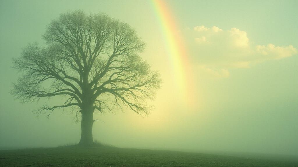 A serene image showing ethereal tree branches dancing against a soft, misty backdrop with a vibrant rainbow. The style evokes surrealist oil paintings with high-definition photography details.