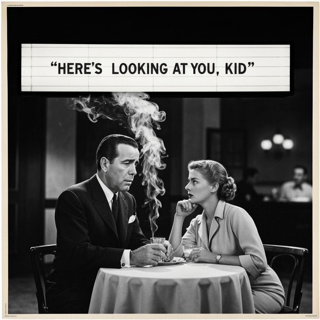 A vintage movie poster for Casablanca, featuring Bogart and Bergman in a smoky cafe. Captured in high-contrast black and white with dramatic shadows for a classic film noir feel.
