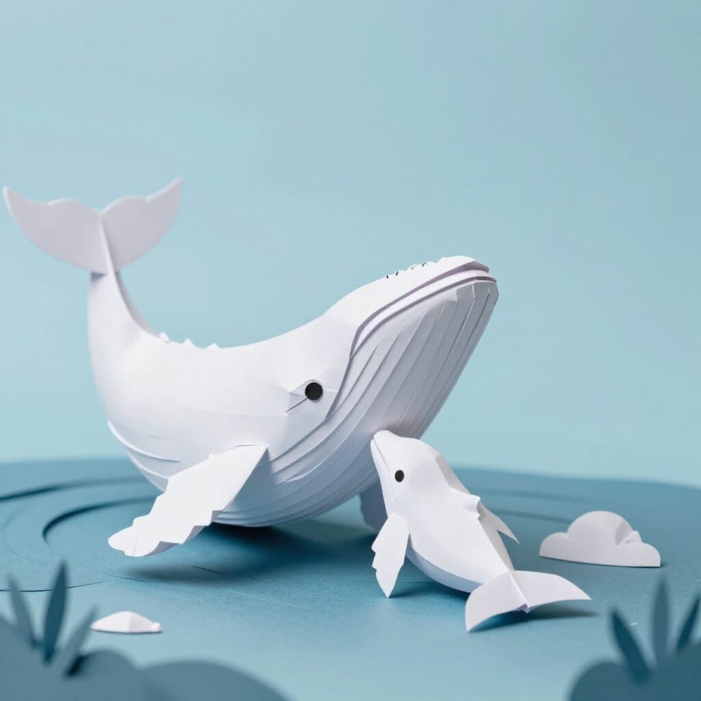This image shows a serene ocean scene with a mother whale and her calf, rendered in a unique origami papercraft style. Soft focus and intricate folds create a tender moment.