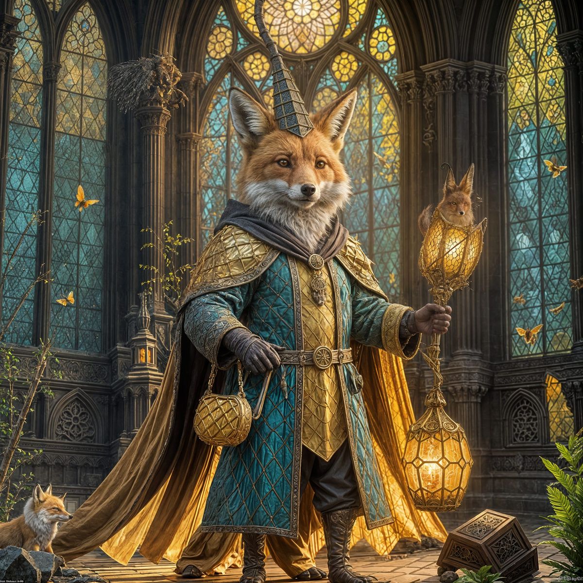 This image shows a fantastical fox wizard standing in a gothic cathedral constructed from intricate honeycombs, surrounded by golden light and buzzing bees.