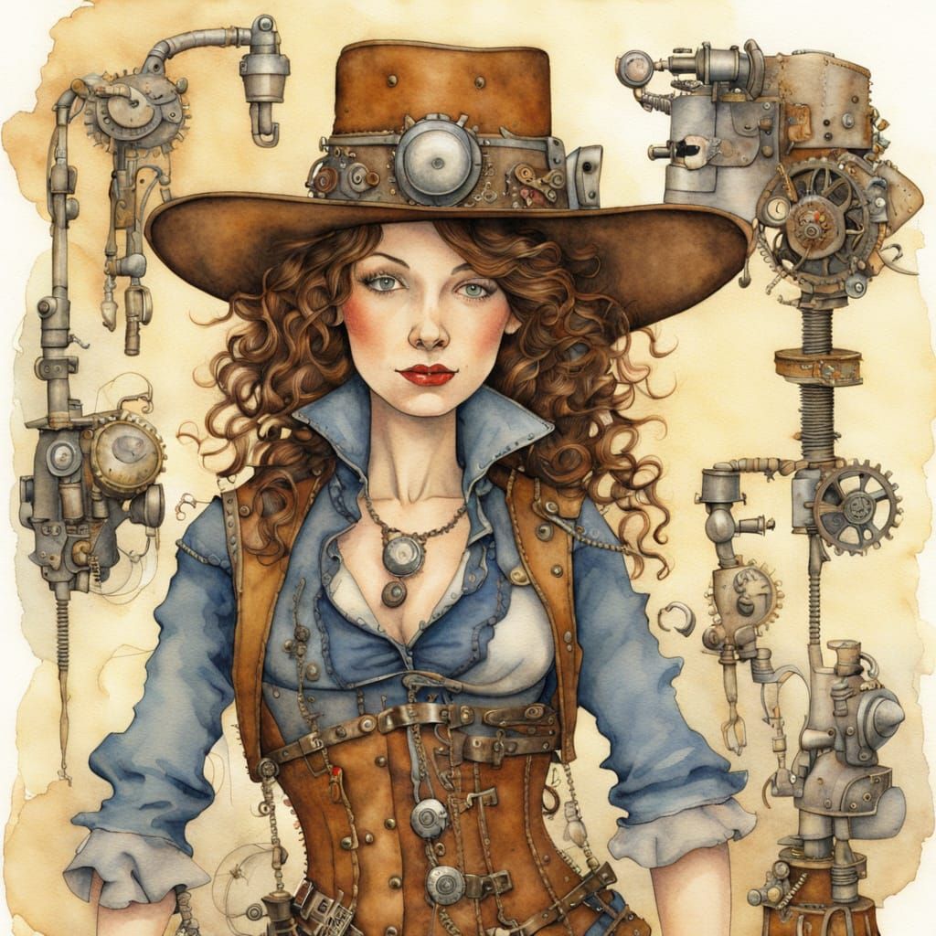 This image shows a steampunk-style cartoon of a cowgirl with mechanical exoskeleton parts. The artwork is rendered in watercolor and evokes whimsical illustration.
