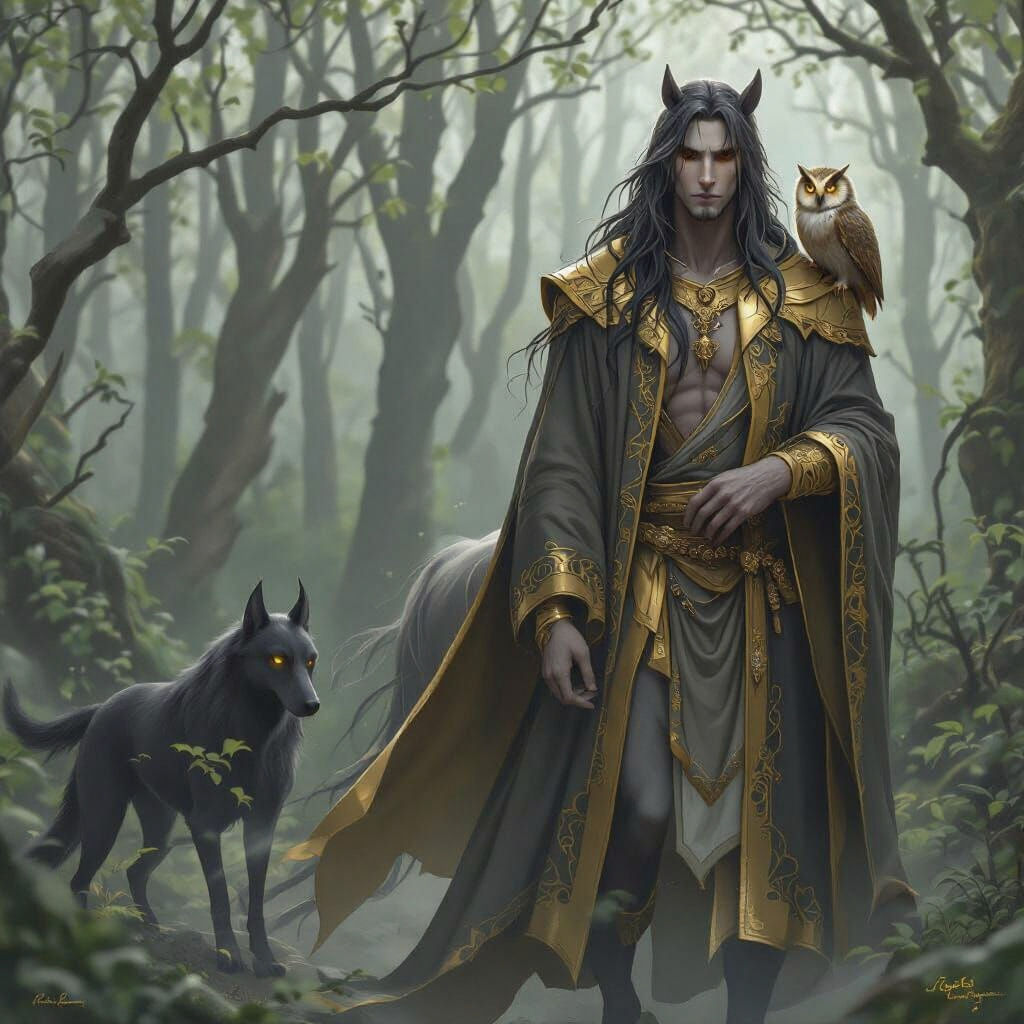 A striking picture of a centaur standing in an enchanted forest. The centaur has a gray horse body and dark hair, wearing a golden robe. A small owl and a dark hound are by his side, in a 3d anime style.