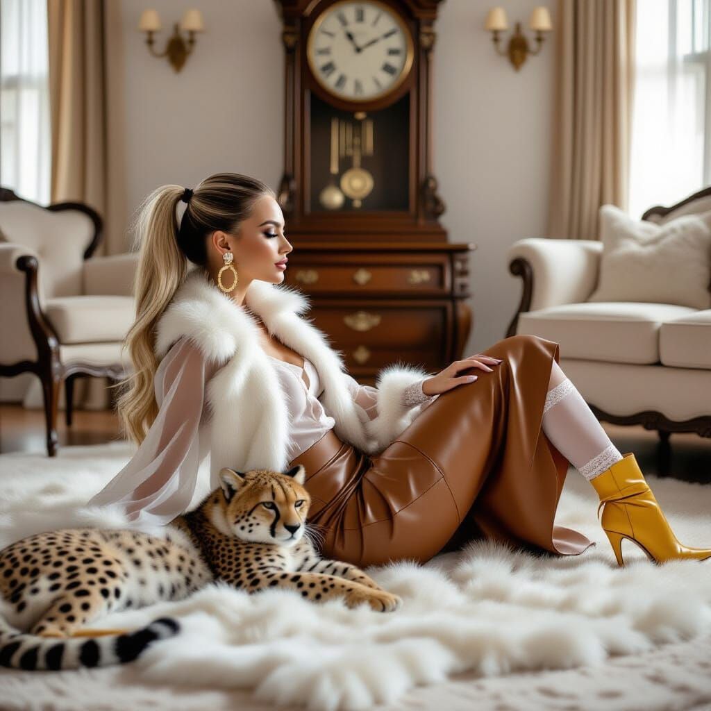 This image features a blonde woman with a ponytail in a living room, reclining on a white fur coat. She wears a translucent blouse, leather skirt, and yellow boots, while a cheetah sits nearby.