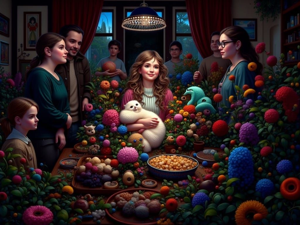 This image shows a young woman holding a rescued kitten in a sunny Bay Area home. Volunteers share a meal, creating a heartwarming scene filled with community, hope, and a vibrant, uplifting atmosphere.
