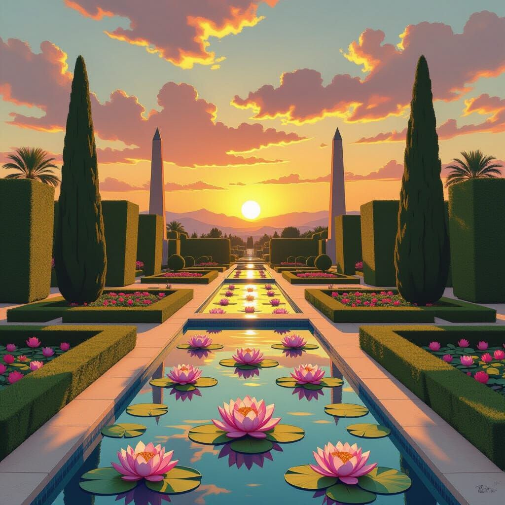 Imagine a colossal, hyperrealistic Egyptian garden bathed in the golden light of the setting sun, with meticulously manicured hedges forming intricate hieroglyphic patterns, vibrant lotus flowers floating serenely on crystal-clear pools, and towering obelisks casting long shadows across the landscape. ...