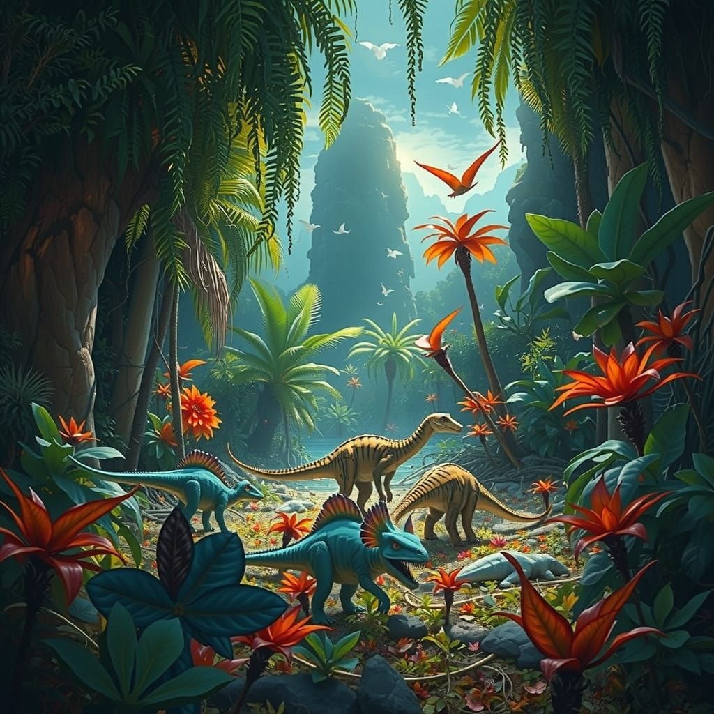 This image showcases a vibrant Jurassic jungle filled with exotic, colorful plants and small dinosaurs. It features dramatic lighting and rich, deep colors, evoking a primeval atmosphere.