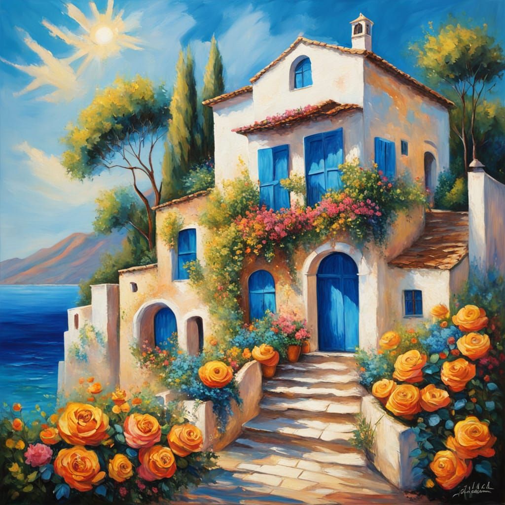 A striking picture of a sun-drenched Mediterranean stone house with blue windows, entirely engulfed in vibrant flowers and climbing vines. The image is rendered as an impasto oil painting with bold, saturated colors.