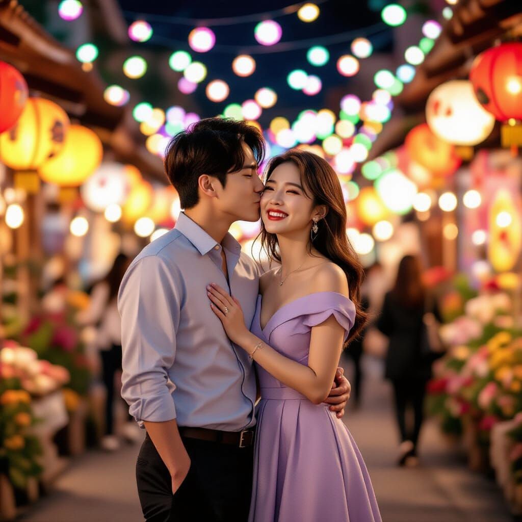 This image shows a Korean couple amidst vibrant festival lights. The scene captures a romantic moment reminiscent of K-dramas, with dreamy atmospheres and intimate photography. It is rendered with cinematic flair.