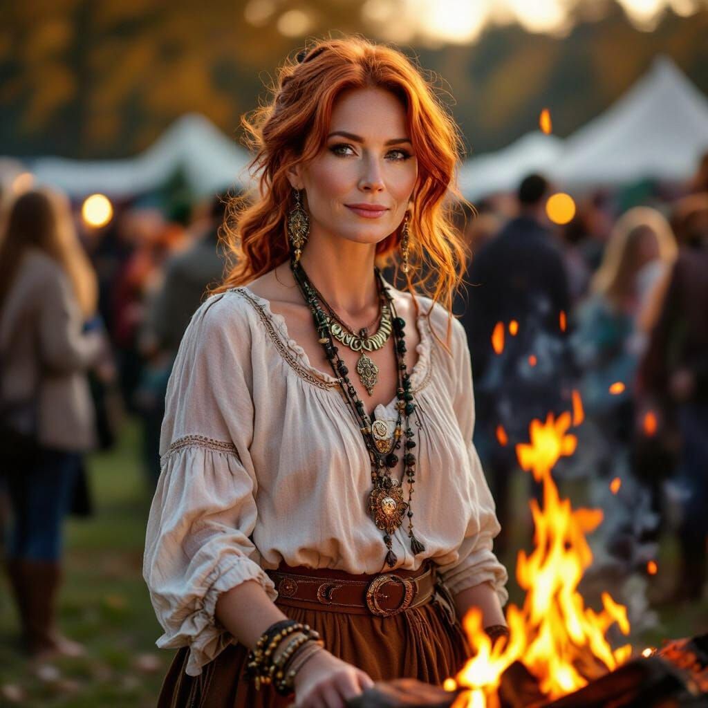 A hyperrealistic photo of a woman at a lively autumn Pagan festival. Golden hour light illuminates the scene, highlighting her jewelry and the festive atmosphere.