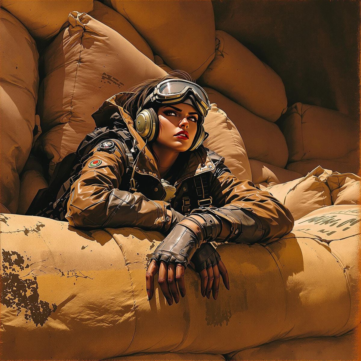 This image shows a determined female pilot in a leather jacket, pausing on a sandbag wall. The scene is bathed in warm, earthy tones, with a retro science fiction aesthetic.