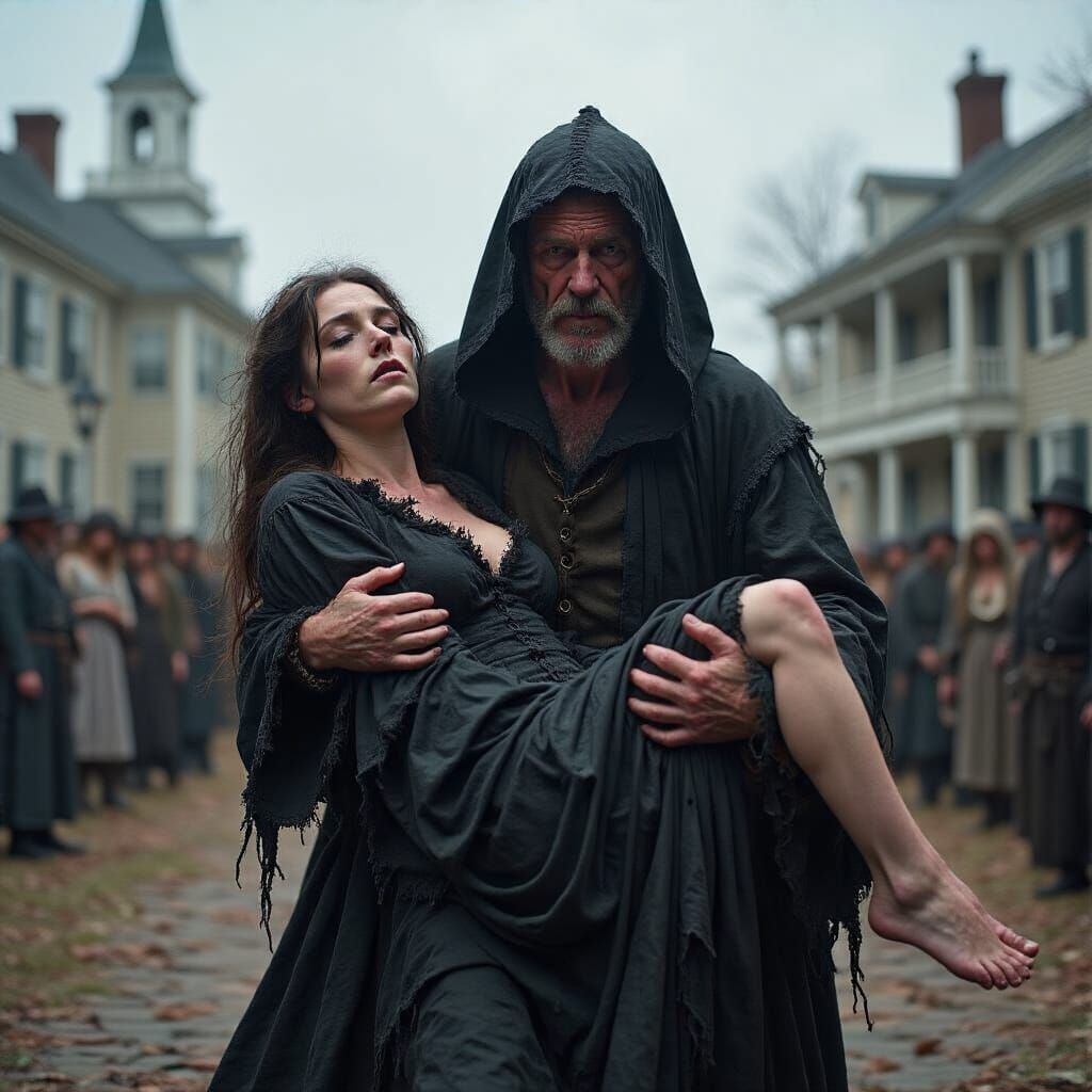 This image shows a dramatic scene of a witch hunter carrying an unconscious woman in 17th-century Salem. The photorealistic image features cinematic qualities, dramatic lighting, and a detailed, atmospheric background.