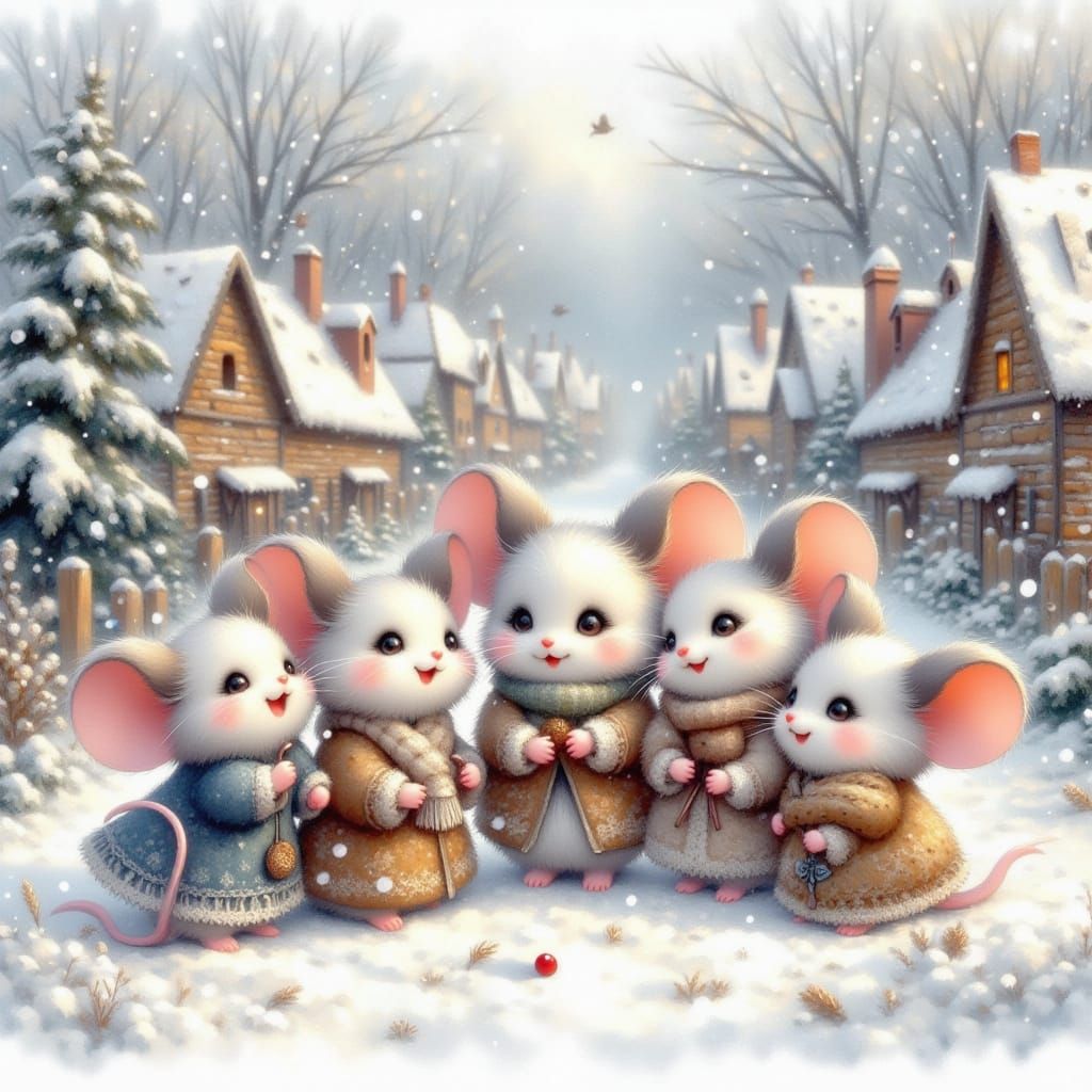 This image showcases photorealistic mouse children in a snowy village, singing and playing music. The scene features soft watercolor details with silver and gold accents.