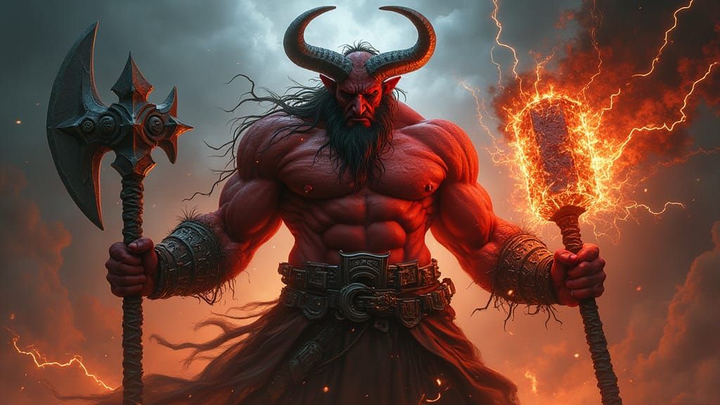 This image depicts a powerful tiefling warrior standing in a dramatic thunderstorm, surrounded by intense lighting and rich shadows. The dark, baroque style artwork showcases intricate details and textures, emphasizing contrast and a sense of dark grandeur.