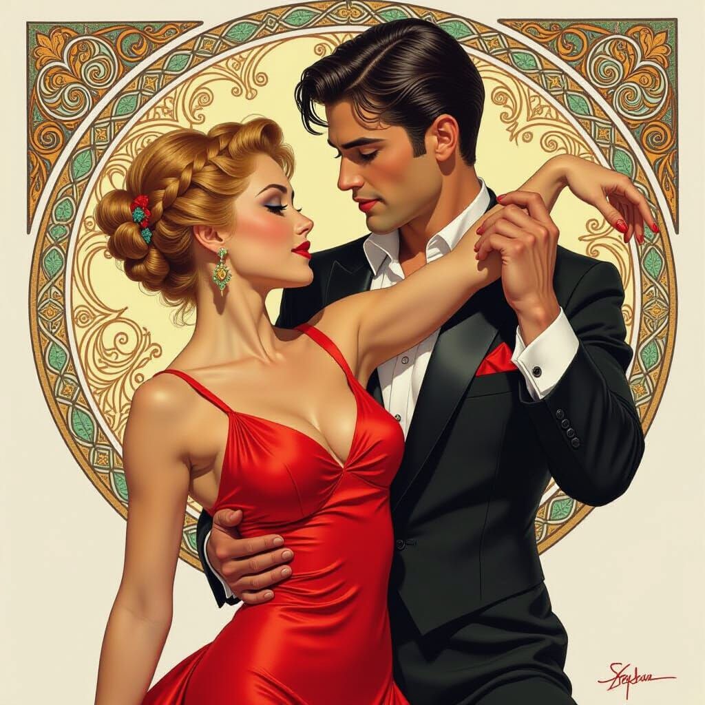 A striking picture of a man and woman performing a complex Latin dance move. The hyperdetailed charcoal drawing features dramatic lighting and expressive lines in an art nouveau style.