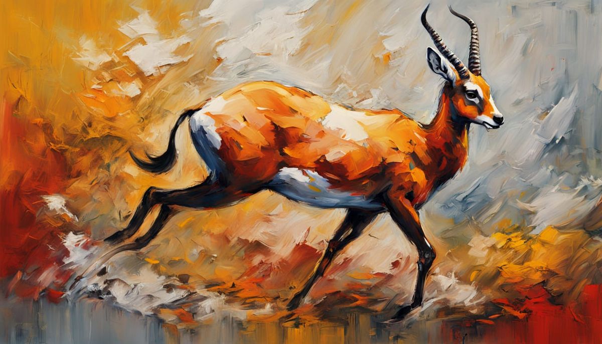This image depicts a majestic gazelle running in a misty savannah landscape, captured in a dynamic and expressive oil painting style reminiscent of Zao Wou-ki's thick, textured brushwork and vibrant colors