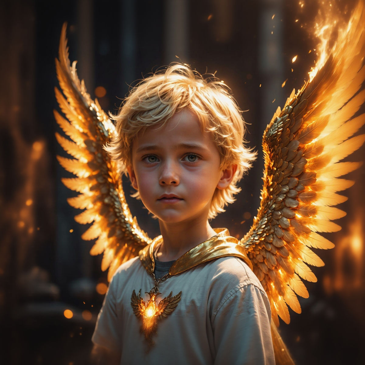 "Concept art. Close up. Blond European child boy with fire angel wings. Medium shot. Vibrant digital art. Glowing voltage eyes. Soft, feathery wings. Warm, heavenly god rays. Dynamic, volumetric lighting. Best quality, 8k resolution, incredibly detailed, cosmic, cheerful, heavenly, fiery, divine, spiritual, euphoric."