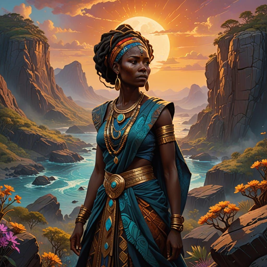 This image shows an African woman on an alien world. Rendered as vibrant fantasy concept art, she is surrounded by bioluminescent flora under soft, golden light with swirling nebulae.
