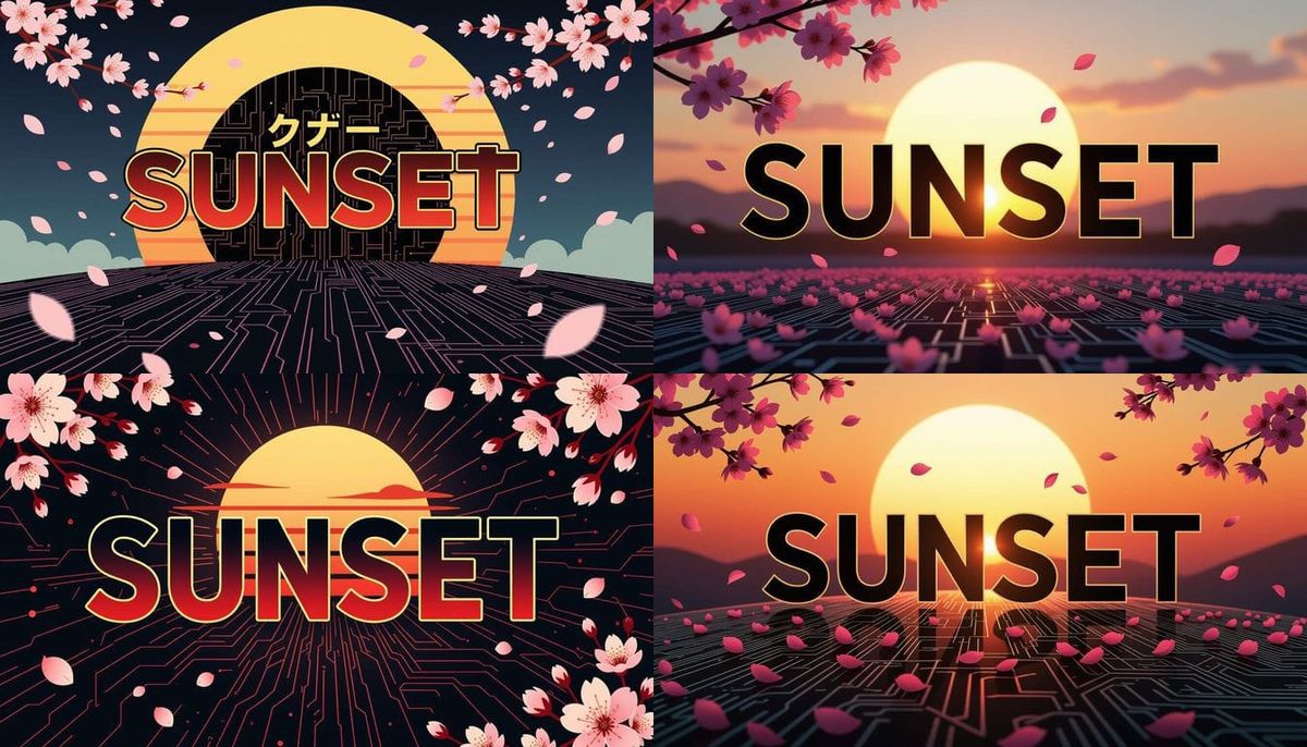 This image shows a modern logo design for 'Sunset' in an anime style. It features a gradient from black to deep red, neon gold outlines, and falling cherry blossom petals against a stylized rising sun.