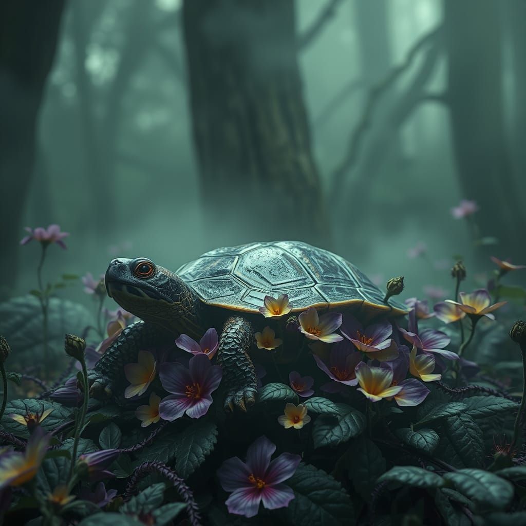 A striking picture of a turtle covered in poisonous flora, set against a misty, dark-toned woodland backdrop. Hyperdetailed textures and a vibrant color palette create a captivating, cinematic scene in a dynamic digital art style.