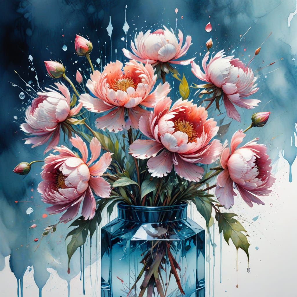 This concept art features a bouquet of crystal peonies in pink and coral hues, presented in a blue geometric vase with glistening dew drops. Rendered with delicate watercolor technique and cinematic stylization.