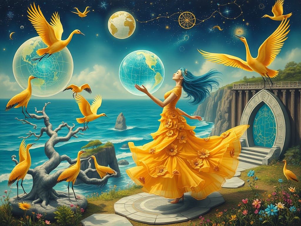A vibrant image of a serene woman with turquoise hair in a golden dress, holding a glowing sphere. The scene includes holographic spheres, cranes, bonsai, a portal, and a turquoise seascape, rendered as an oil painting.