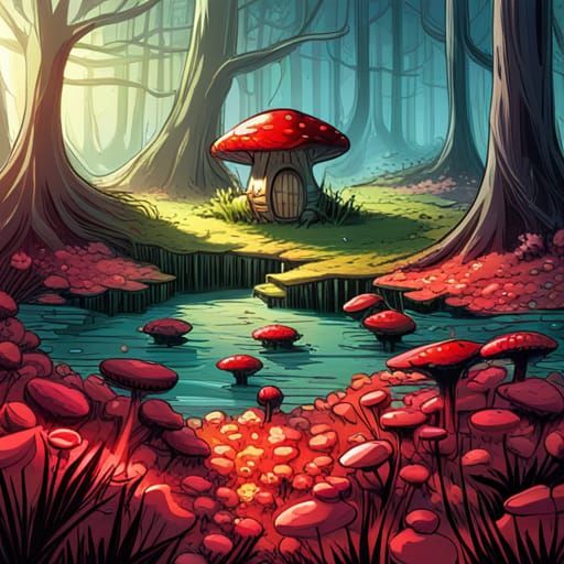 A whimsical red mushroom house nestled in an enchanted swamp under the spring sunlight. The scene evokes a high fantasy cottagecore aesthetic reminiscent of comic book art.