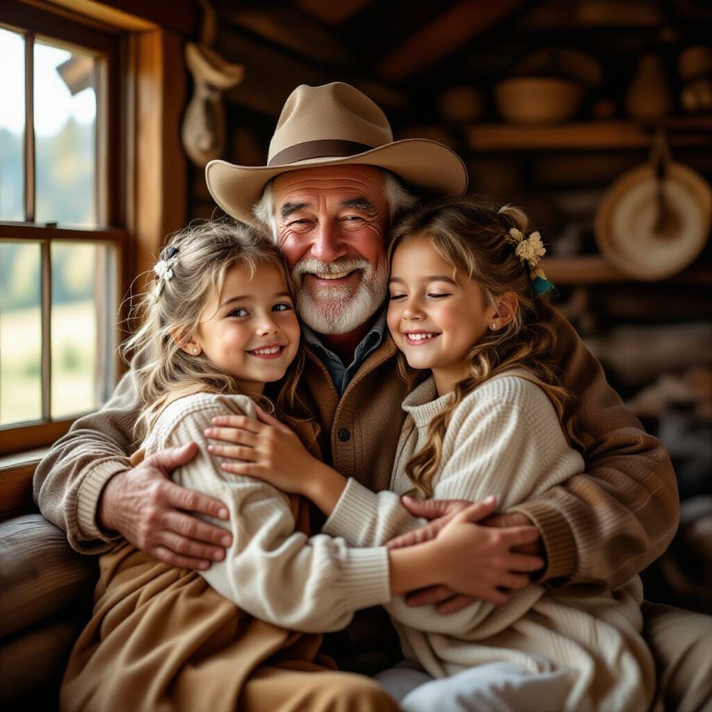 A heartwarming image showing a grandfather embracing his two smiling granddaughters in a rustic cabin. The artwork is reminiscent of painterly styles, with warm lighting and natural textures.