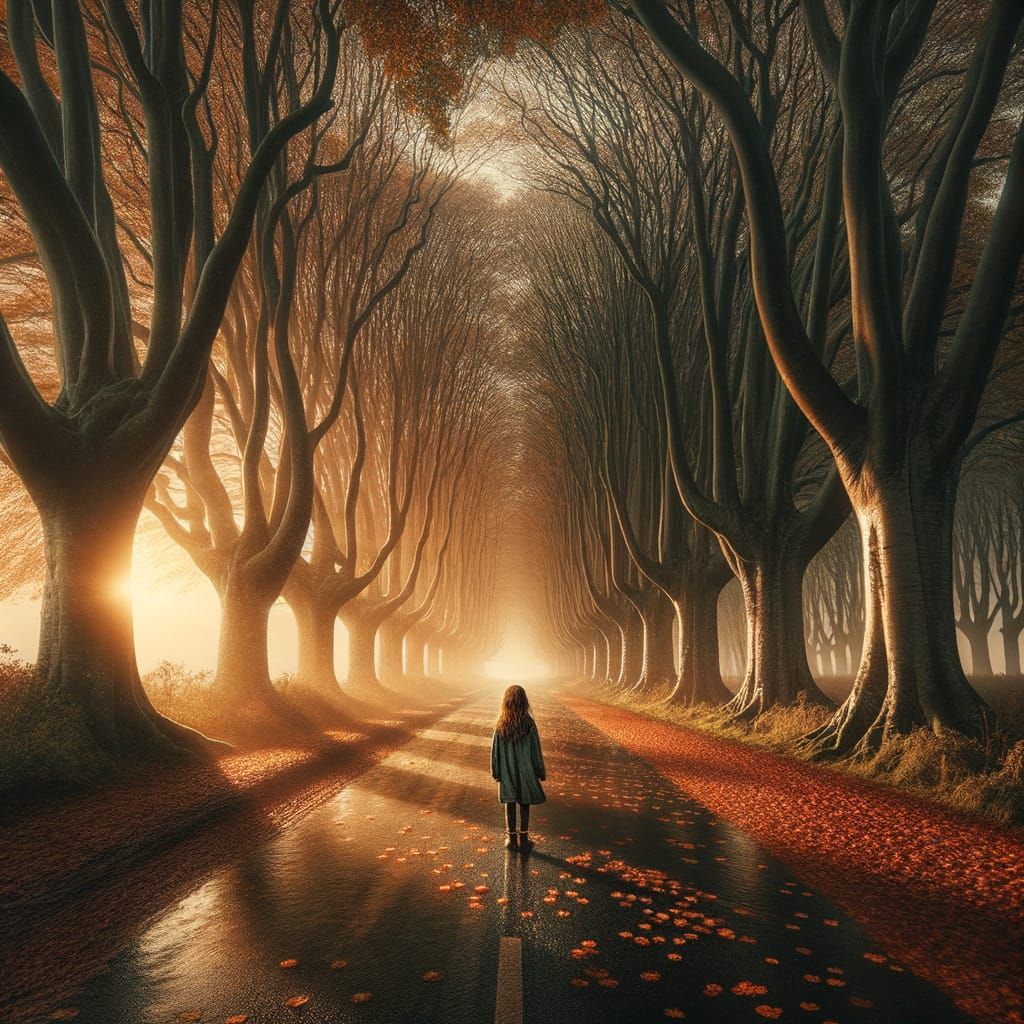 A girl stands on a wet, leaf-strewn road at sunset, with sycamore trees obscuring a hidden forest. Rendered as a dramatic, maximalist digital matte painting with intricate detail.