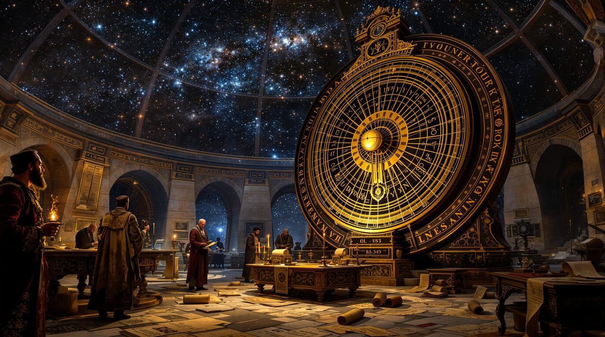 This image shows Nasir al-Din al-Tusi at the Maragheh Observatory, surrounded by astronomical instruments under a starry sky. The scene is rendered with hyper-detailed textures and dramatic lighting, reminiscent of digital art.