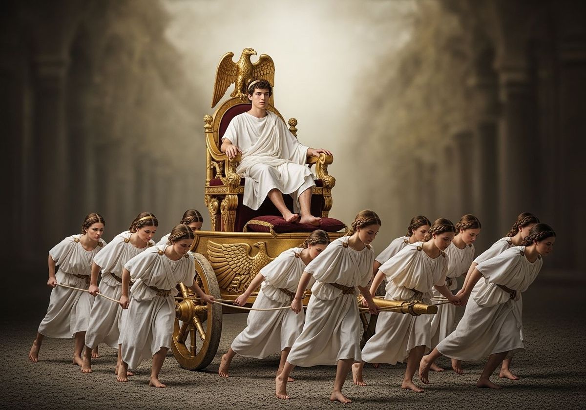 This image shows a youthful Roman Emperor in a white toga sitting barefoot on a golden chariot throne. Female servants pull the chariot. The scene is captured with soft lighting and a shallow depth of field, reminiscent of Baroque art.