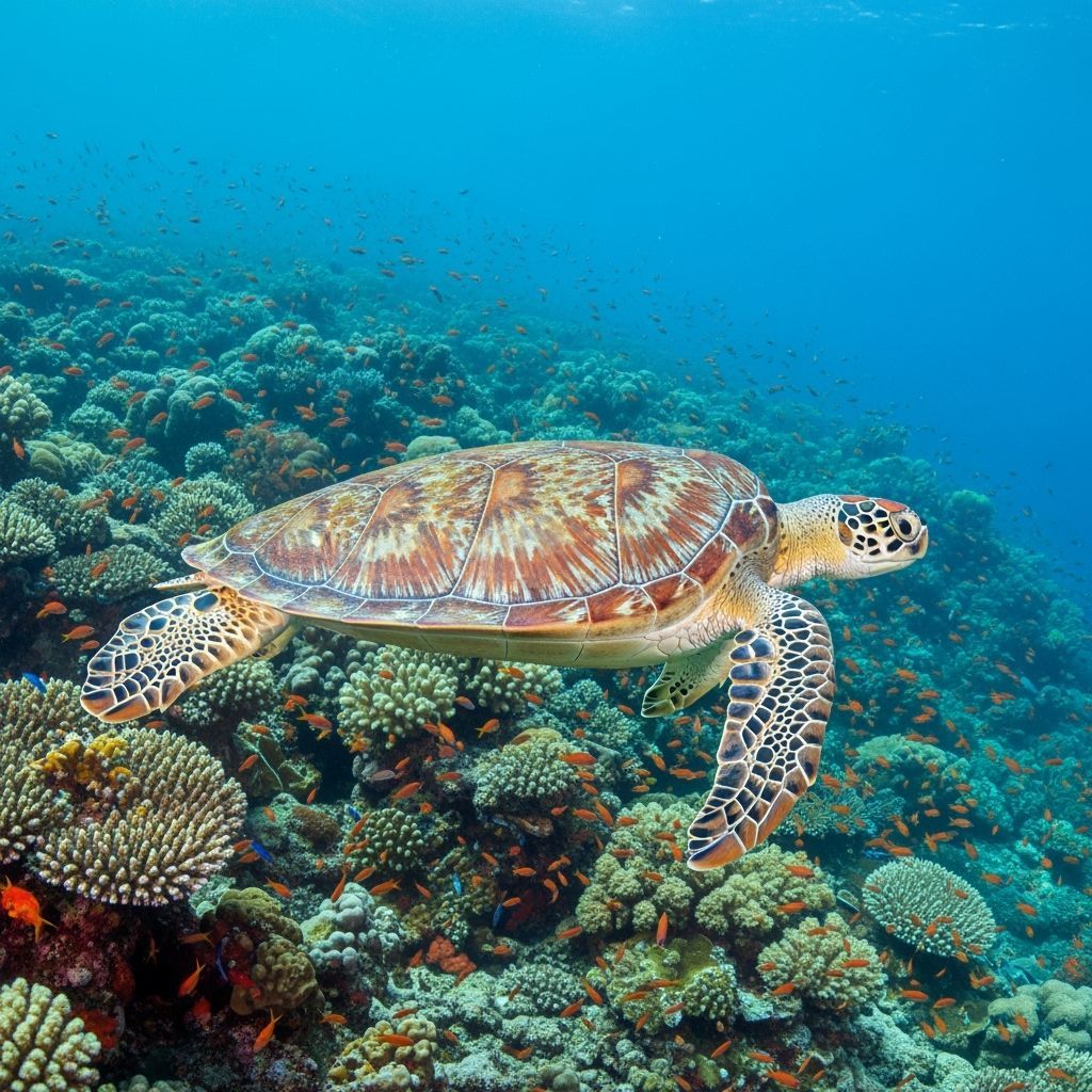 This image shows a sea turtle swimming near a coral reef. The turtle is captured in cinematic light, highlighting its shell and form against the colorful coral and fish. The image has a shallow depth of field.