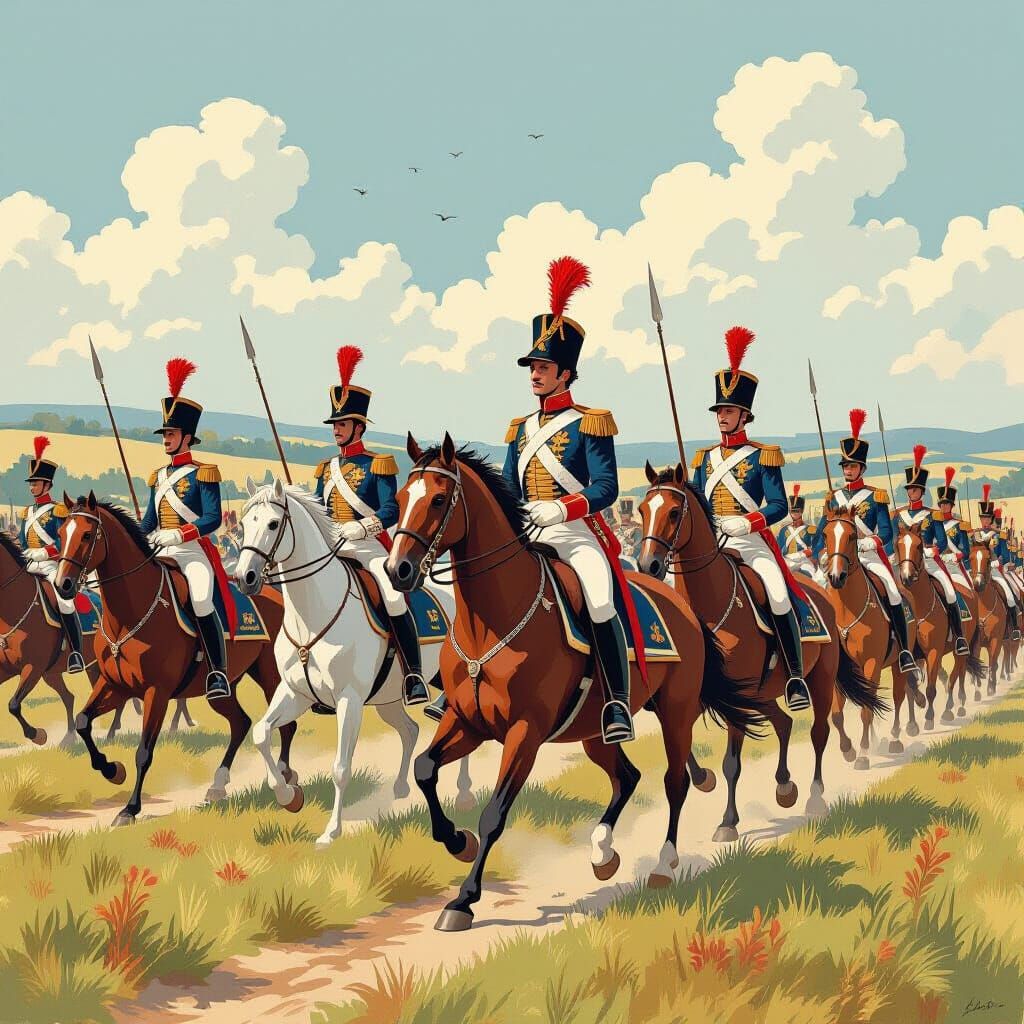 This detailed gouache painting depicts Napoleon's army with charging cavalry and intricate uniforms, evoking lyrical and symbolic illustration styles with expressive brushwork.