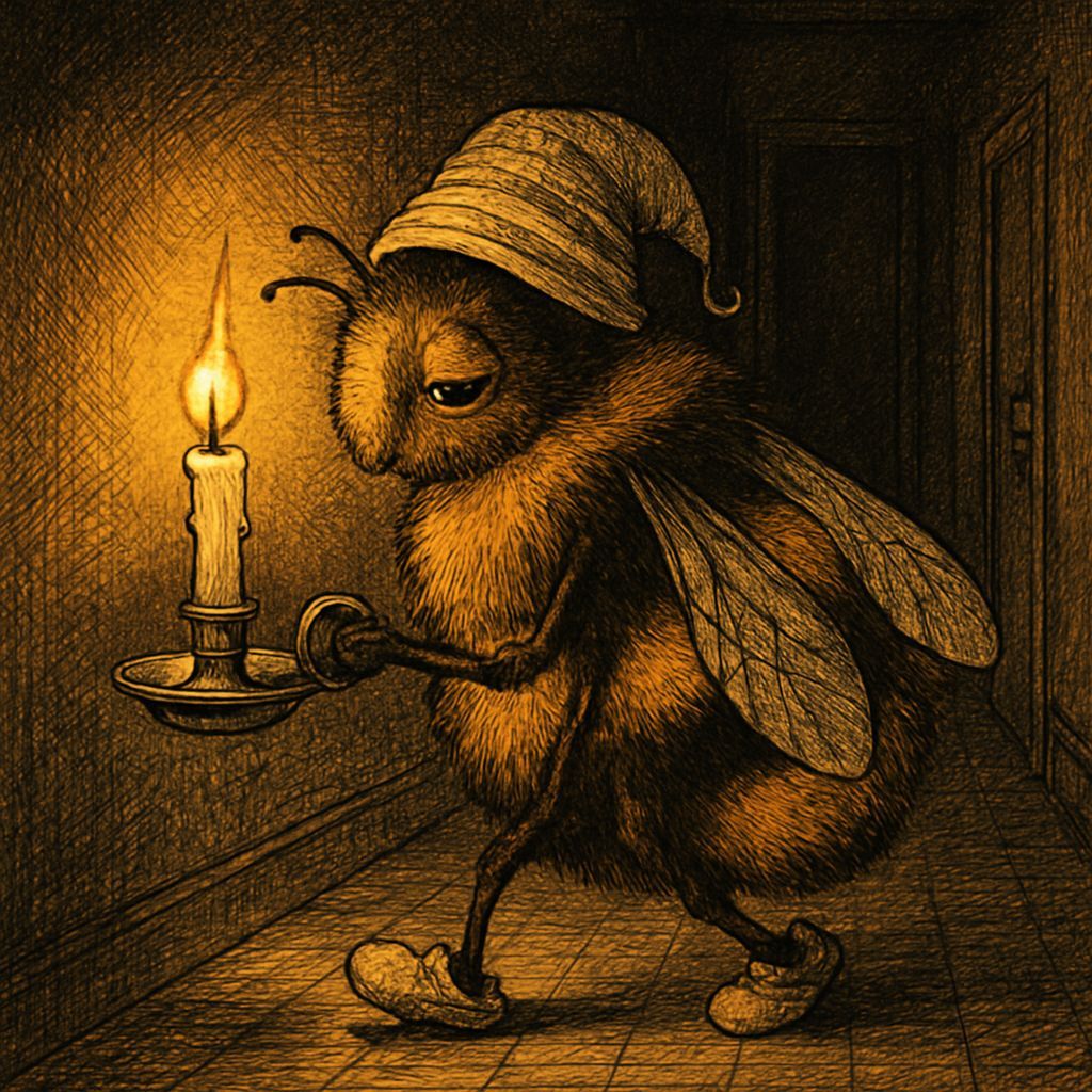 This image shows a sleepy bumble bee in slippers and a nightcap, carrying a candle down a hallway at night. The image is rendered in ink and watercolour on a black canvas.