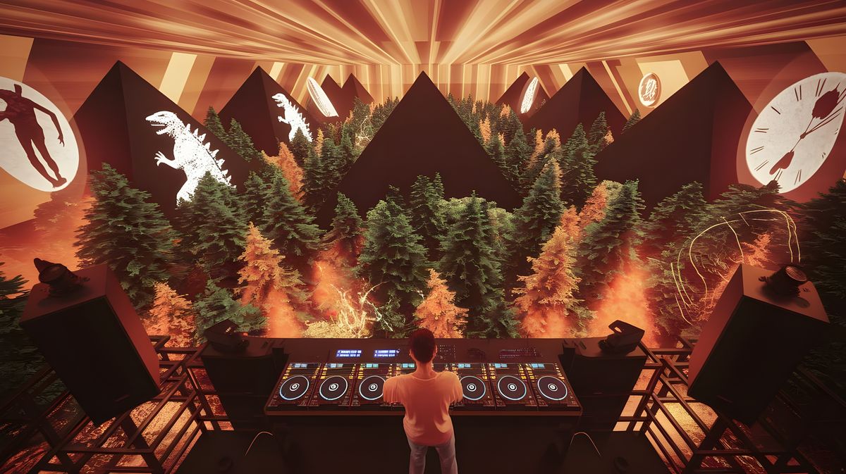 This image shows a surreal forest disco with DJ Cat Pope at the turntables. Black pyramids, Godzilla projections and melting clocks enhance the psychedelic atmosphere of this 3D rendered digital art.
