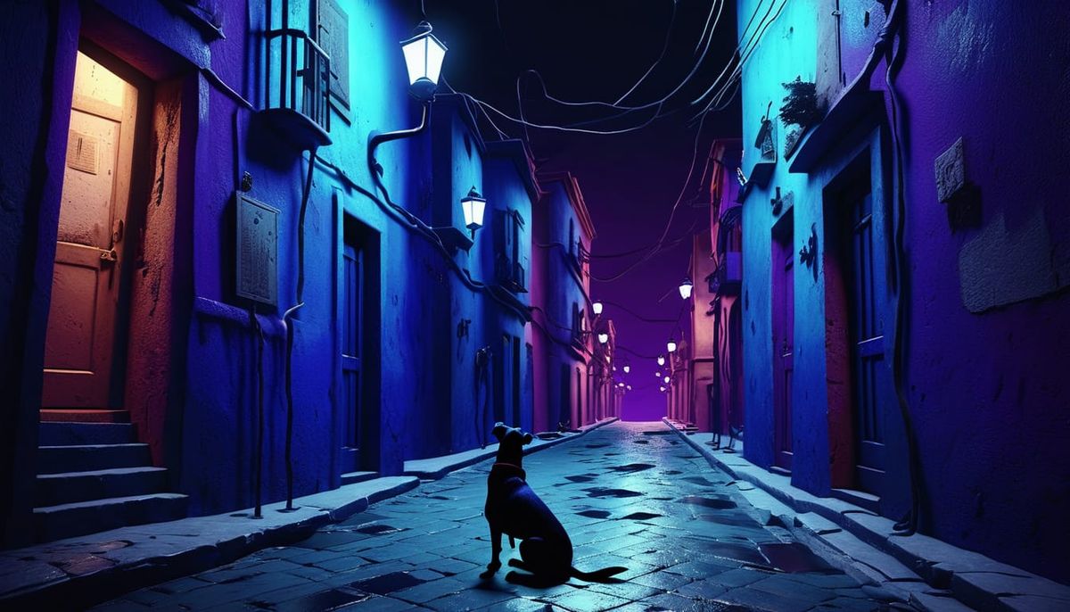 A surreal image showing dogs howling in a deserted city with twisted alleyways. The artwork is inspired by Salvador Dali, using dark blue and purple hues to create a moody atmosphere.