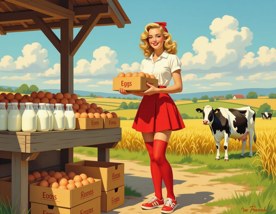 A vibrant image of a young woman at her farmstand, selling eggs and milk against a backdrop of rolling farmland and a sunny sky. The artwork is reminiscent of 19th-century rustic realism.