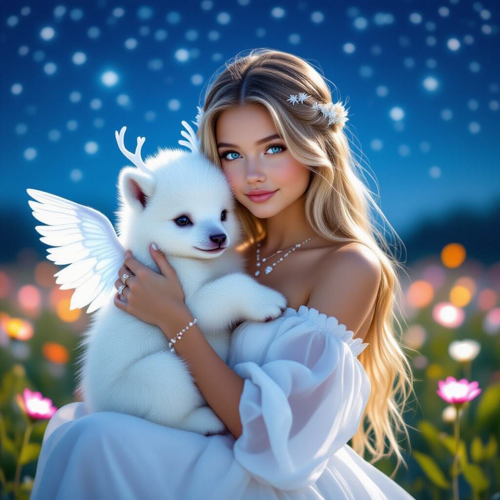 This image shows a beautiful young woman holding a baby yeti under a starry sky. She wears a flowing white dress and celestial jewelry. The scene is filled with glowing cosmic flowers in a surreal style.