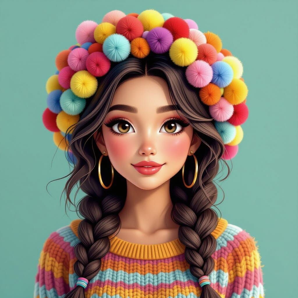 This image shows a stunning young woman playfully constructed from colorful pom poms. The composition is ultra-detailed, bringing a vibrant and whimsical aesthetic to the artwork.