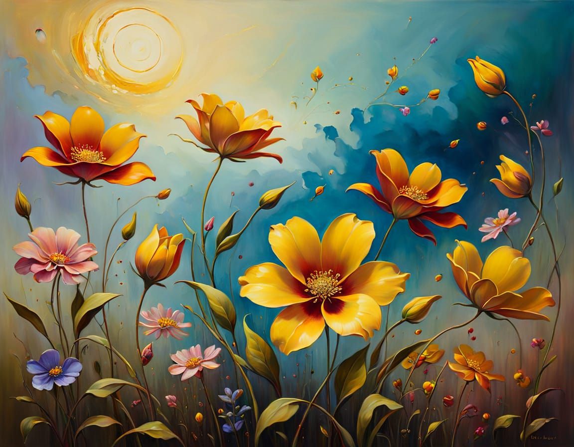 A vibrant expressionist painting of flowers blooming in warm golden light. The close-up shot highlights the soft petals and delicate textures in a surreal and impressionistic style.