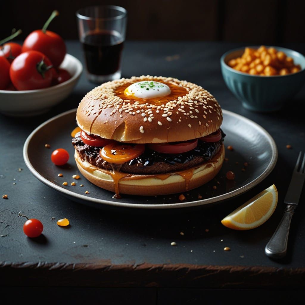 This image is a still life of a delicious steak in a film noir aesthetic, capturing the classic and modern elements of a culinary scene