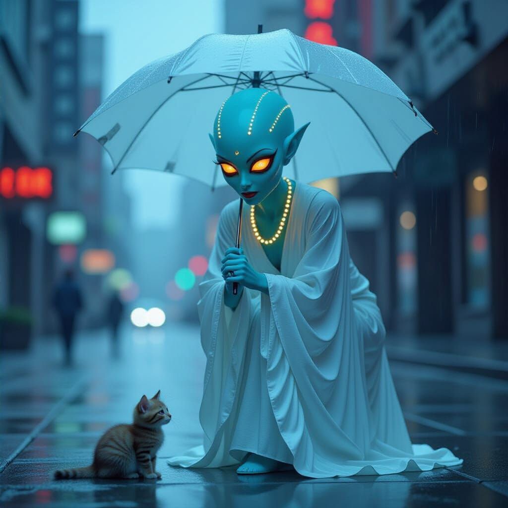 This image depicts a blurry, vintage-style scene of an aqua-skinned alien sheltering a kitten in a retro futuristic city. The artwork features a faded, dreamy aesthetic reminiscent of old VHS film stills.