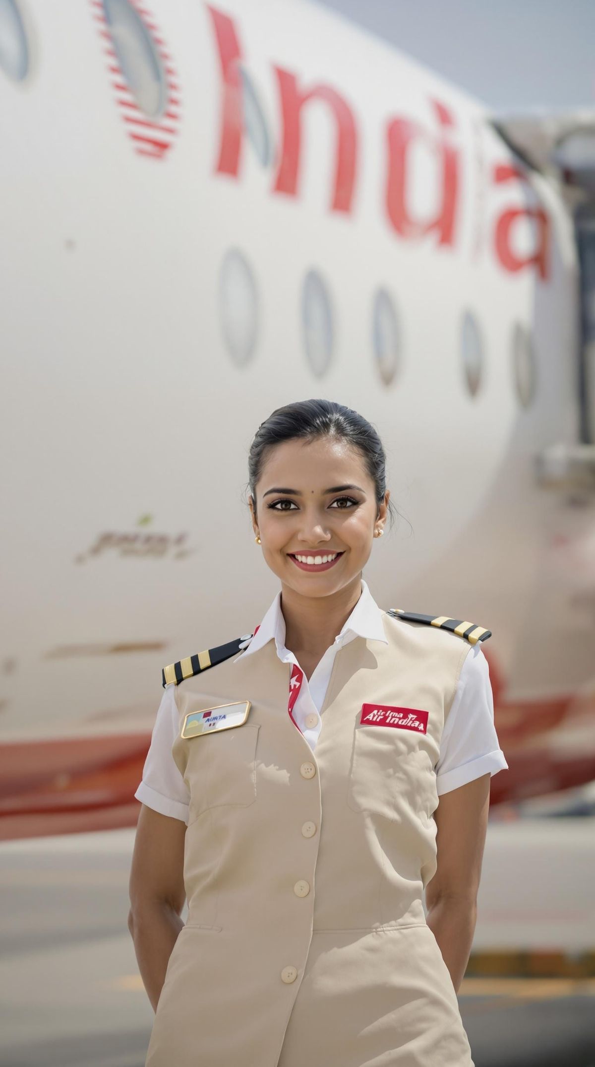 A captivating portrait of a young Pakistani woman in her Air India pilot uniform, exuding confidence and charm as she stands before a massive airliner, with a soft focus on her expressive eyes and radiant smile, reminiscent of cinematic realism.