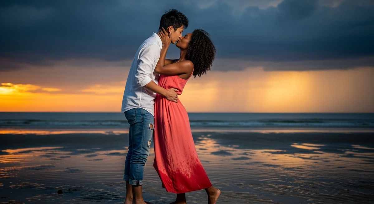 A striking picture of a couple embracing at the beach during sunset. The silhouettes of the man and woman are set against a stormy sky in romantic realism.