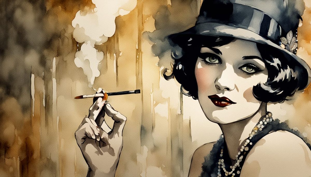 This image shows a flapper girl smoking in a 1920s style speakeasy. The watercolour painting features soft focus, swirling smoke, dim golden lighting, and art deco elements to evoke vintage glamour.
