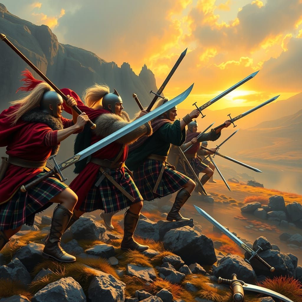 This image depicts a dramatic battle scene between Highland warriors from Clan MacLeod and Clan MacDonald on the rugged Isle of Skye, set against the backdrop of a breathtaking sunrise.