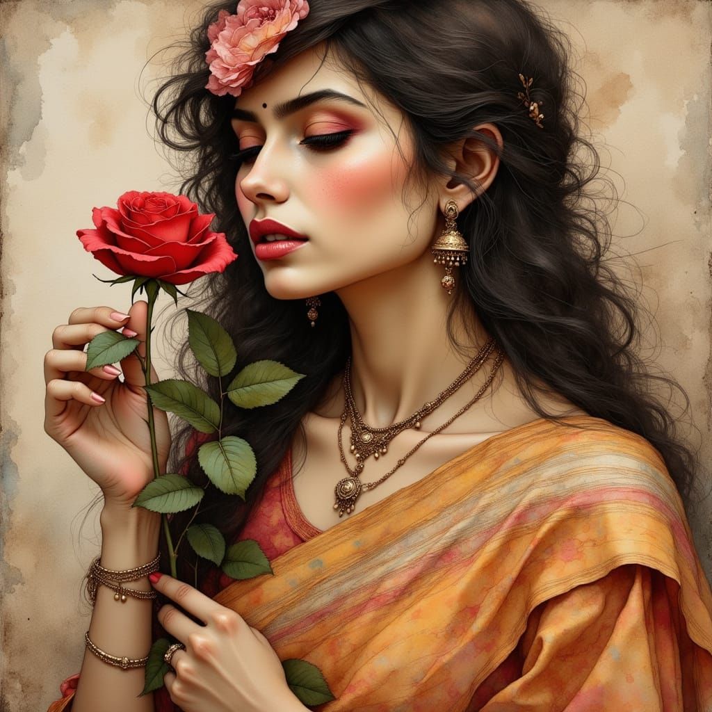 This image shows a serene young woman holding a red rose. She has Indian and Japanese features and is adorned with traditional jewelry in an elegant and tranquil composition.