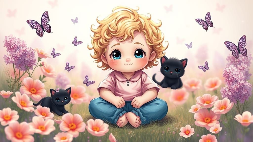 This image depicts a charming, chibi-style girl gnome surrounded by colorful flowers, playful kittens, and whimsical details in a fantasy-art aesthetic reminiscent of vibrant, dreamlike scenes.
