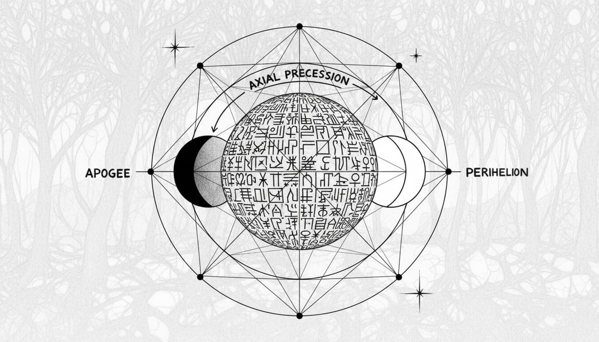 This minimalist black and white drawing illustrates the lunar cycle with hieroglyphics and geometric shapes. It features a wireframe diagram showing orbit lines, apogee, and perihelion.