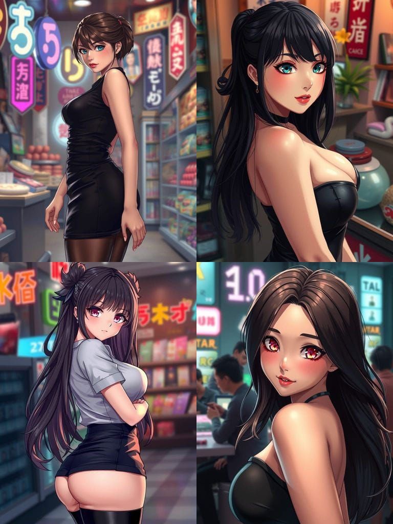 This image depicts a full-body view of a curvy alien woman in an anime style. She has shiny skin and hair, and is wearing a tight shirt and short black skirt. The background is highly detailed.
