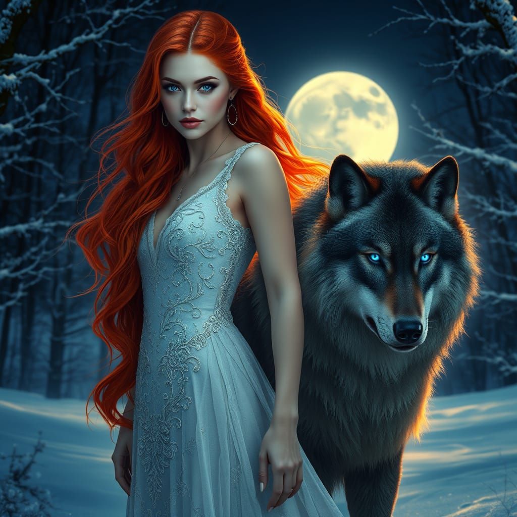 This enchanting image features a majestic woman with long, flowing red hair standing in a snowy forest at night, surrounded by a powerful wolf and a winter wonderland of crystalline branches and snow-encrusted trees, creating a captivating dark fantasy scene with a balance of deep blues, purples, and gol...